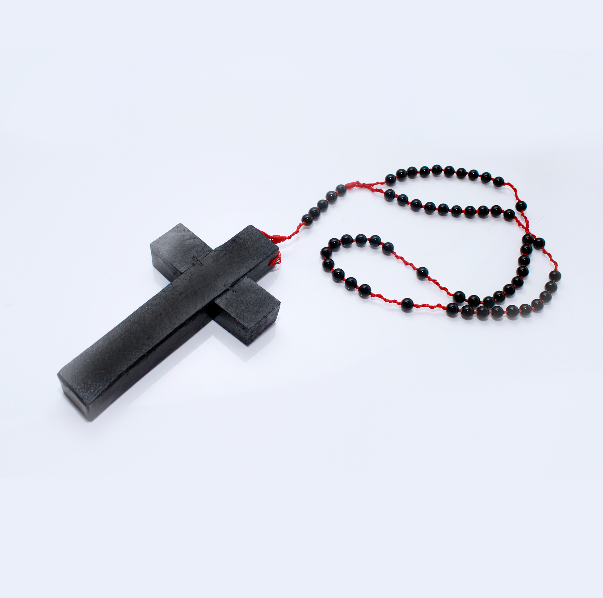 Hermoso rosario con cruz de madera pintada y cuentas de cristal en negro y rojo